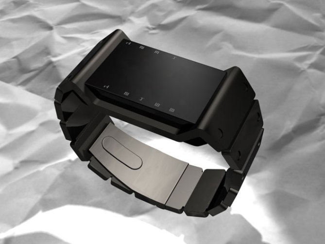 Like something from the Caterpillar factory, the heavy steel frame of this design bends in beneath the interface to create the case and bends out again to form the strap.