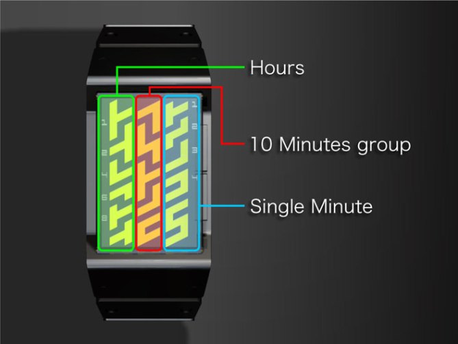 The LED display is like a rugged tire track, the maze of shapes illuminate to display units of time in three distinct groups. Hours, groups of 10 minutes and single minutes move in the same direction.
