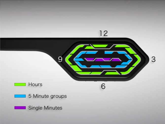 To take a call simply put the band onto your head and you’ll be able to listen through the speaker and use the integrated mic to talk. To listen to music you can plug in your own earphones and wear the band around your neck. The time is displayed on one side of the band with hours and minutes in the same position as numbers on a clock.