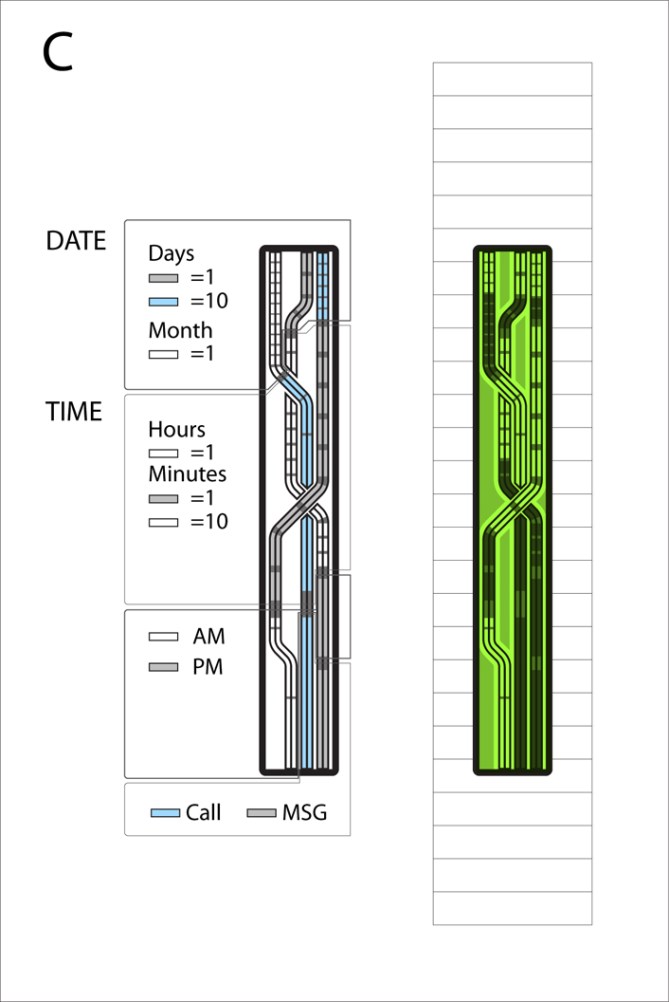 Design B: Took me awhile to get it, but its actually pretty cool. I feel like it would be better on a more square-ish design, instead of this long, narrow screen one. Maybe if each segment (date, time, ect) was made up of different colors. I don’t know.