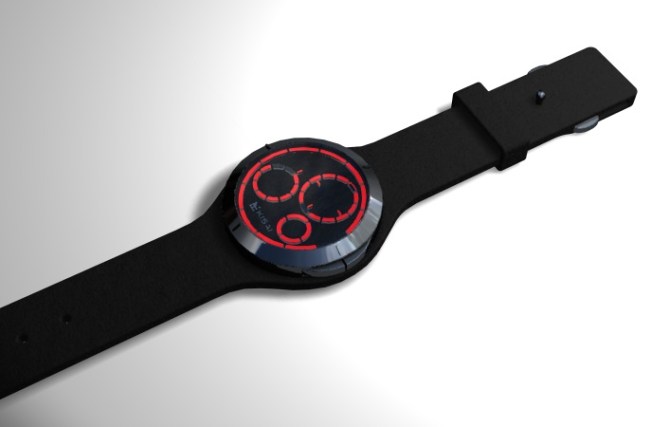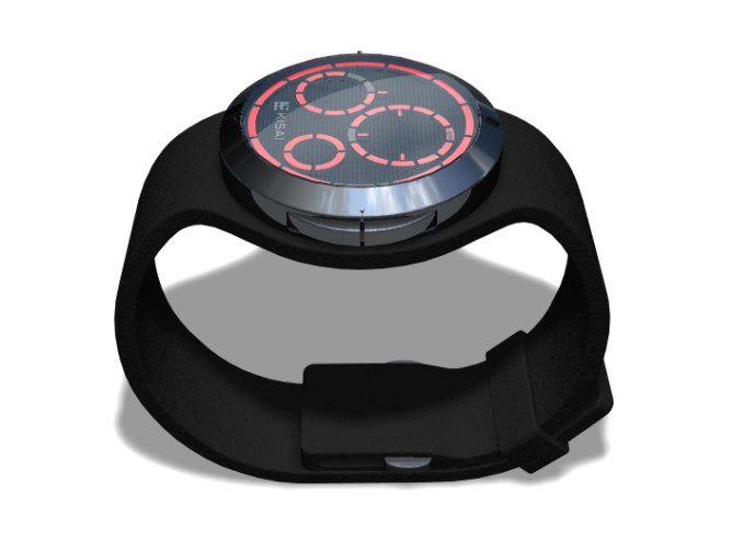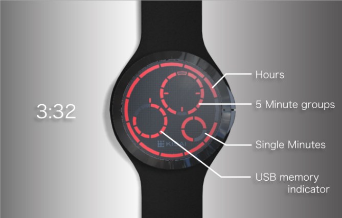 The watch has a rubber wrist band and stainless steel case and the interface features rings of LEDs to display the time; hours on the outside, groups of five minutes in the upper circle, four single minutes in the lower circle. The remaining ring indicates the used/remaining storage capacity on the flash memory. The design is also rechargeable via USB.