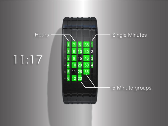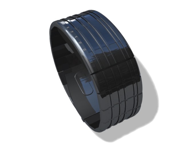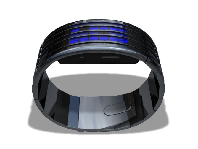 A sleek stainless steel concept that will wrap around your wrist like a futuristic bracelet. Grooves in the face continue into the strap and the time is presented with LEDs that illuminate in lines between the grooves; hours 1-12, 5 minutes groups and single minutes.