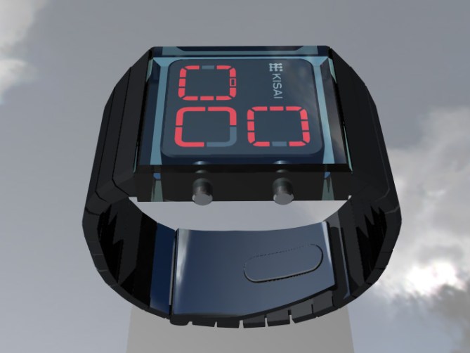 The interface of this design is located beneath a single block of clear acrylic giving the impression of depth. The block is then connected to a strong tapered wrist band. The large control buttons on the side are visible through the acrylic block. Three red zones display the time; hours in the top right, five minute groups in the bottom left and four single minutes in the bottom right.