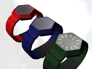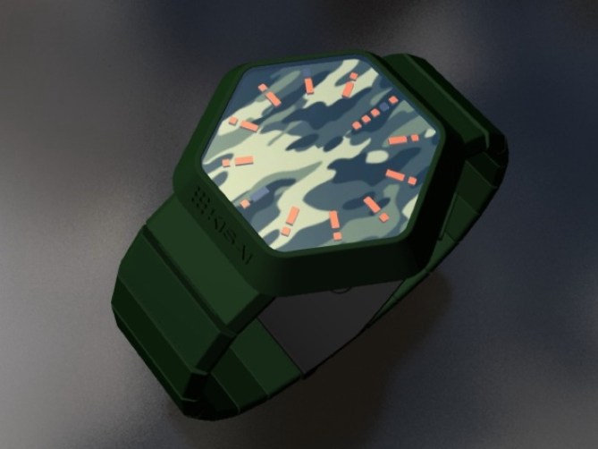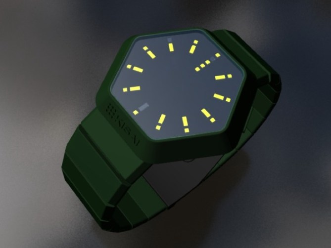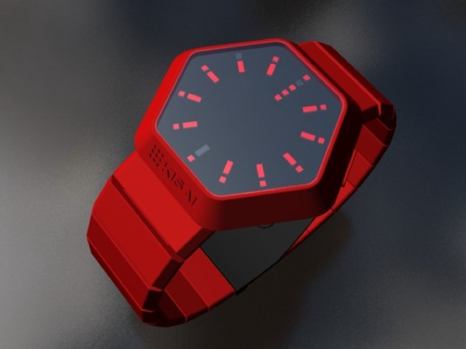 The following images are variations on the Night Vision concept from August 9th. A different interface layout shows hours with the outer ring of dots, in the same position as hours on a clock face. Groups of five minutes are shown in the inner ring with lines in the same position as minutes on a clock face and four single minutes are shown beneath the 12:00 o’clock position. The variations here show different colored cases. Let us know how you feel about these.