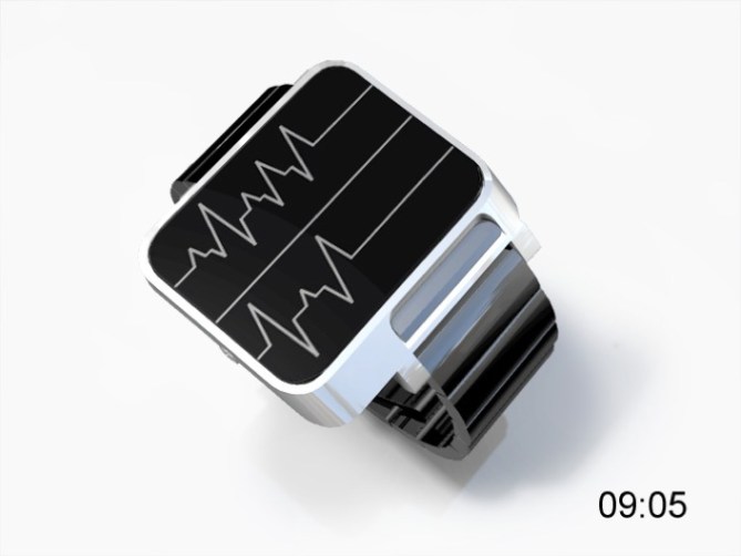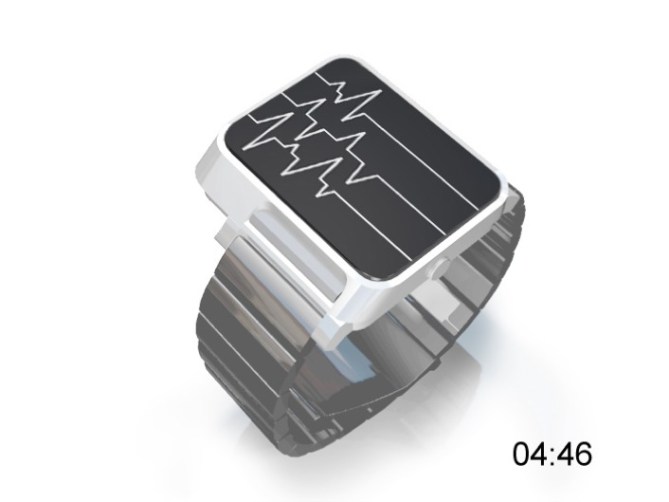 The interface on this concept watch design is like the display of an ECG showing electrical activity. The time is shown very simply; hours 1-12 on the top line, 10 minute groups , 10-50 on the center line and single minutes 1-9 on the lower line. The high and low points of each line indicate each hour and minute.