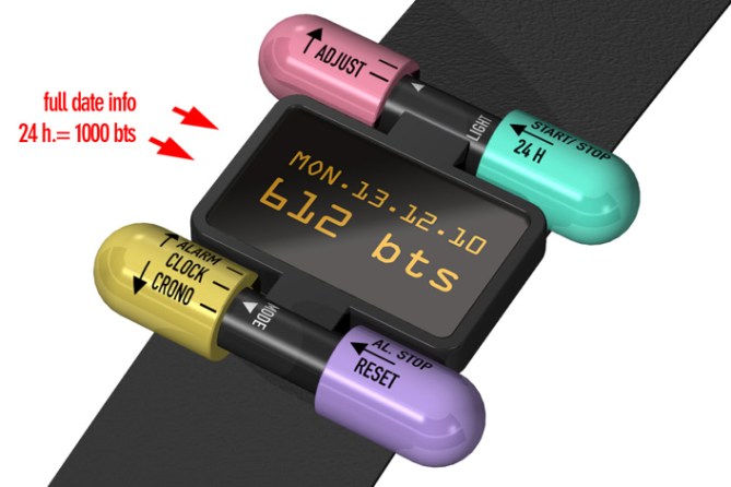 24-hour day is divided into 1,000 beats, and this watch concept also includes alarm clock and date functions. It appears more mechanic with all options clearly exposed. It uses the decimal time used in lots of science fiction materials, such as The Naked Sun by Isaac Asimov, Metropolis by F. Lang, Battlestar Galactica, and French Revolution.