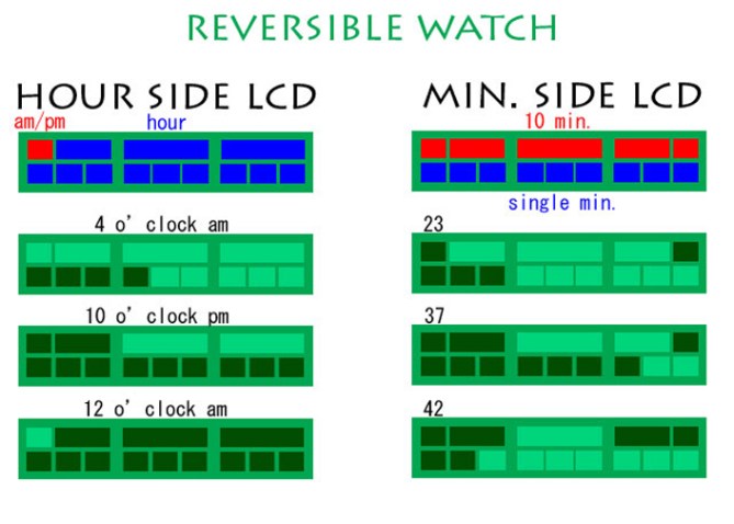 On the hour side, hours are displayed 1 hour per block with one block indicating AM or PM. On the minutes side, the screen is divided into lower and upper portions, one line indicating 10 minute group and the other, single minute group.