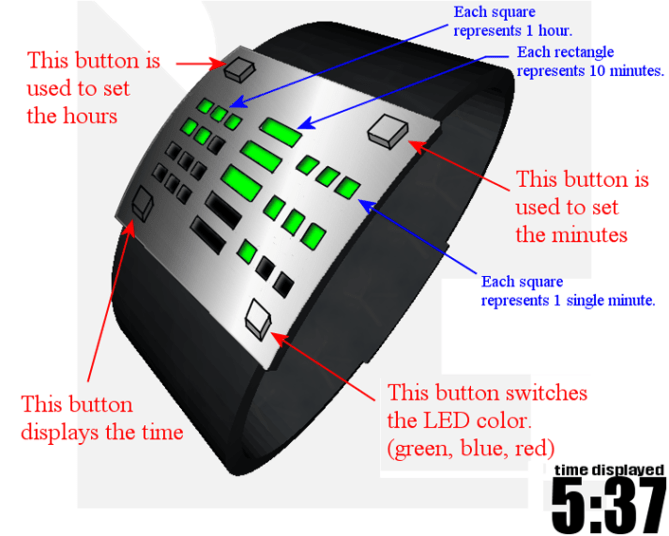 Composed entirely of right angles, time on this watch design is easy to tell. The 12 square LEDs on the left represent the hours, the middle ones represent 10 minutes group, and each of the 9 square LEDs on the right represent a single minute. The LEDs can light up in green, blue, or red. Switching between colors can be easily done with just a touch of a button.