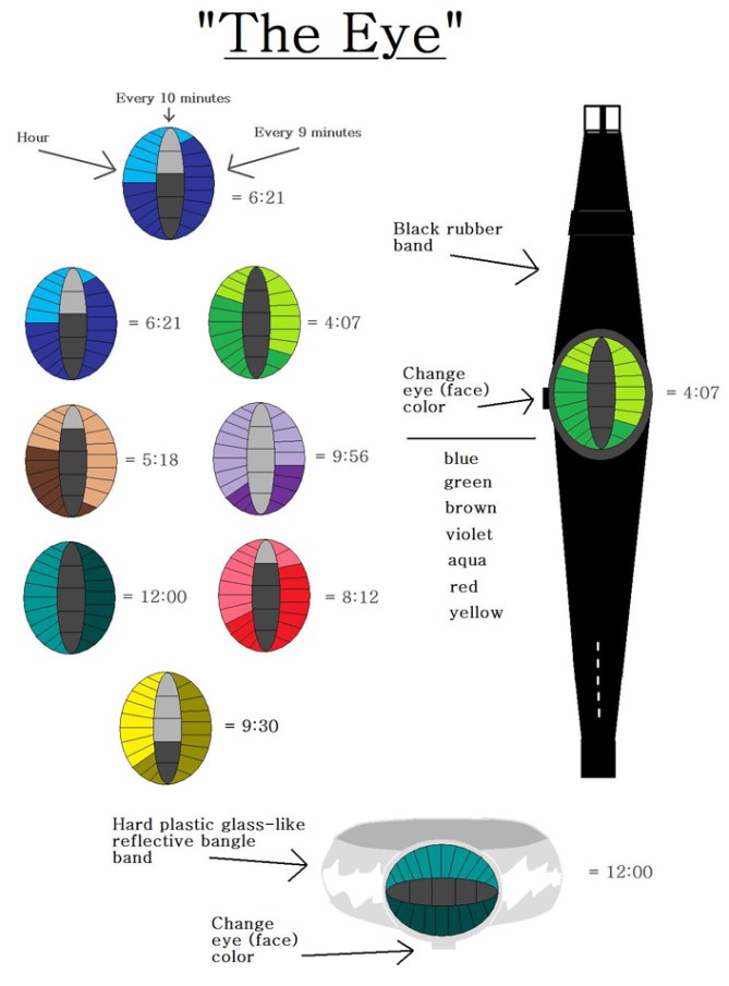 The watch is atomic battery-powered with a face in the form of an eye divided into 3 LED sections, telling the hour, every 10 minutes, and every 9 minutes. The eye color can also be changed. The band choice is either a black rubber band or a reflective, glass-like, hard plastic bangle.