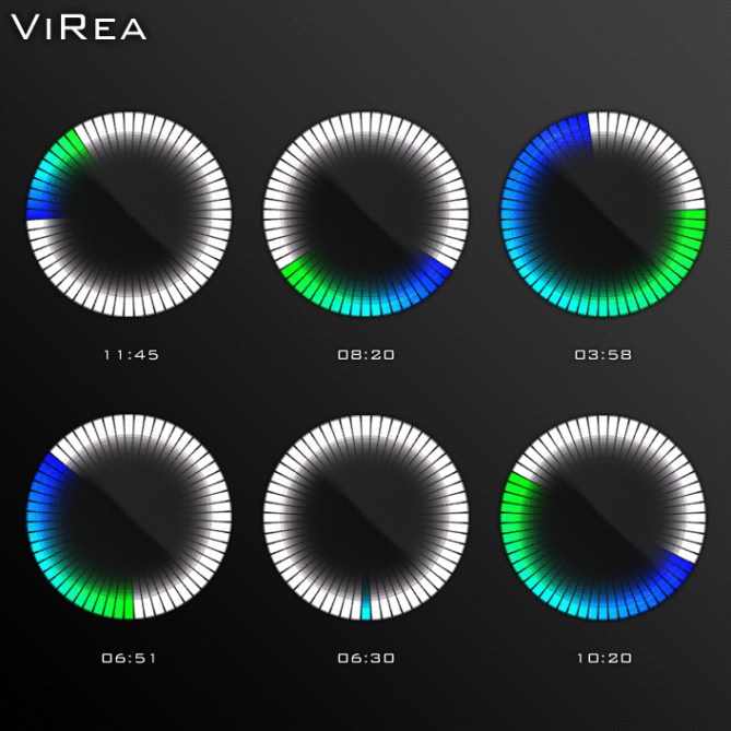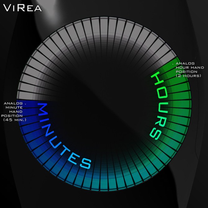 There is a ring of 60 LEDs. Green LD shows the hour position, just like the hour hand of an analog watch. Blue LED shows the minuted position. The space between these LEDs is filled up with a gradient from green to blue. The rest of the ring is lit up in white. There are no numbers to make it simple and intuitive.