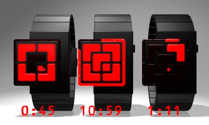 This watch design can be bright enough to light one dark room when all LEDs are lit up. The whole of the square watch face is designed with single colored LEDs divided with thin lines.