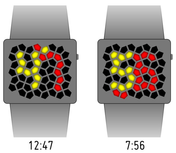 Another very well thought out concept design from Logan. He says: “This is a response to commenters on my previous designs who asked to see more of my work with patterns. The Cairo watch has a sandblasted aluminum face with holes cut out in a pattern called the Cairo tessellation (a pentagonal tiling that supposedly was made with paving stones on the streets of Cairo).Behind each of these holes is either a yellow or a red LED. When the LEDs are off, you can enjoy this mathematical pattern, and, when they are on, the minutes are displayed large in the center, using 3×5 pentagons per digit, and the hours are indicated in the normal clock position using 2 pentagons.  Super easy to read.  The strap is the same style as Kisai Sensai silver — the appearance of a smooth one-piece, but actually adjustable at the back.