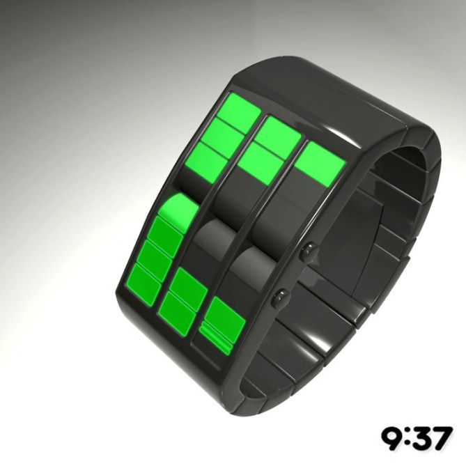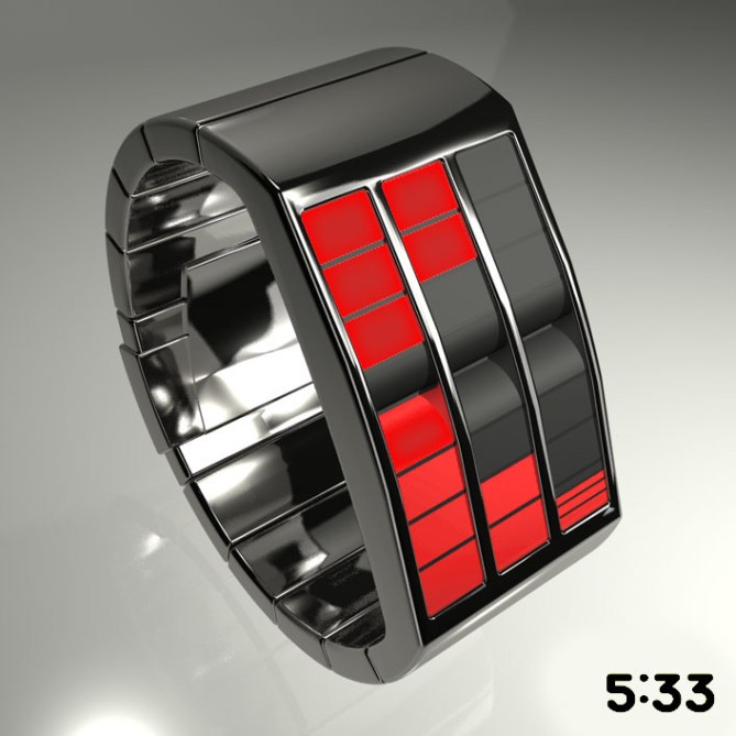 Genghis says: “I wanted to design a watch with a good animation for the display so I decided to split the display in the center with two rounded parts in order to give the impression that the display is rolled out from the center of the watch.You just have to press one of the button on the right side and the animation will start. It is a 12-11-4 style time display by LEDs. I think it is more suited to men and I tried to maintain the classic Tokyoflash style by using metal case and strap.