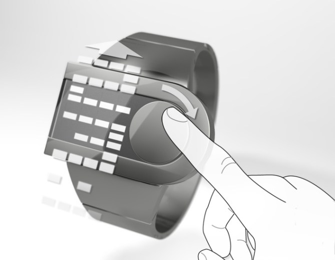 You just have to turn the button to display the time. The time is told by scrolling the numbers on the LCD display. the time is actually told in two finger movements. One button half turn for the hours and another half turn one for the minutes. The potentiometer has 24 notches which corresponds to the scrolling of 4 numbers. The date can be told after the time (not shown on the animation ).