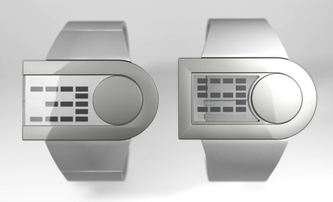 Then we wanted to add a nice animation with this turning button. I designed on two different cases for this watch: one with classical LCD display, and one with transparent LCD display.