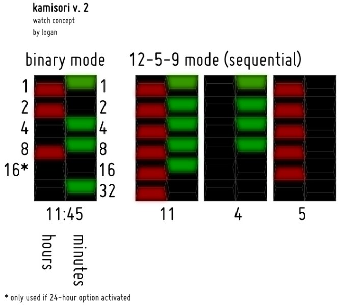 Logan says: “Inspired by Tokyoflash R75, I revised a previous idea to have both binary and 12-5-9 display modes.