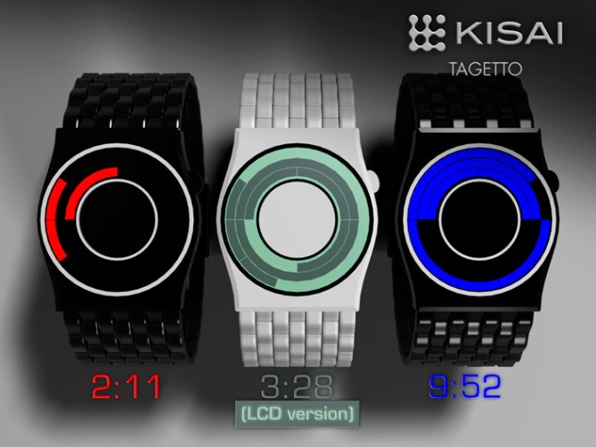 A concept watch design that could be either LED or LCD and is shown in a variety of colors. The time slices build up to create a mysterious target image.The plain case design contrasts nicely against the strap which has detail in the links. Hours are shown in the outer two rings in the top half of the display and minutes are shown in the lower half of the display, single minutes 1-4 in the inner most ring which passes through both halves of the display.