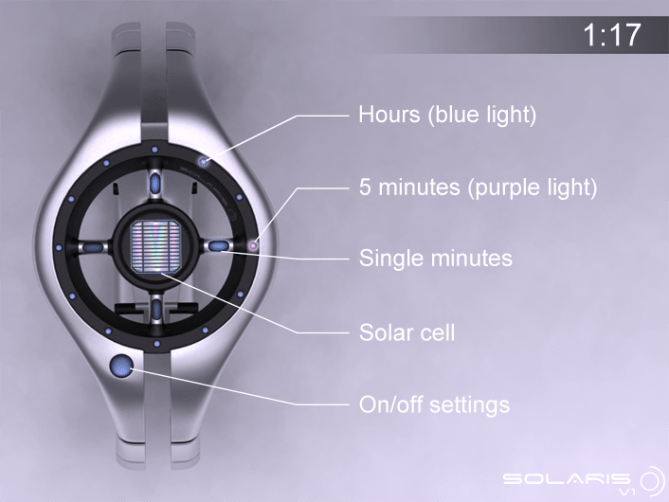 “I saw this new Logitech Keyboard with solar cells and thought it was a good idea for a watch too. As the original feature is a solar cell, I wanted the design to be inspired by the sun.The time is shown by LEDs, with the hours on the perimeter of the design in blue, five minute groups in the same locations in purple. Four single minutes are shown on the cross bars in the centre. This designs is ideal for people who want to buy the latest techno and stylized products.