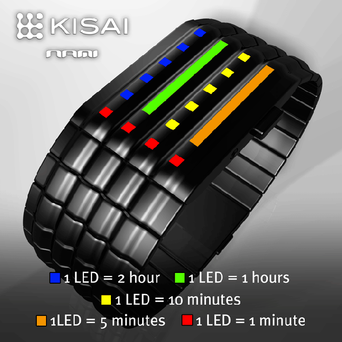 The LEDs are placed on top of the waves. Two LED bars in the upper left-hand column indicates the hour (the first column 1LED = 2 hours and the second column, 1 LED = 1 hour). Two LED bars in the upper right-hand column indicates the 10 and 5 minutes. The bottom four LEDs indicate 1-1 minutes.
