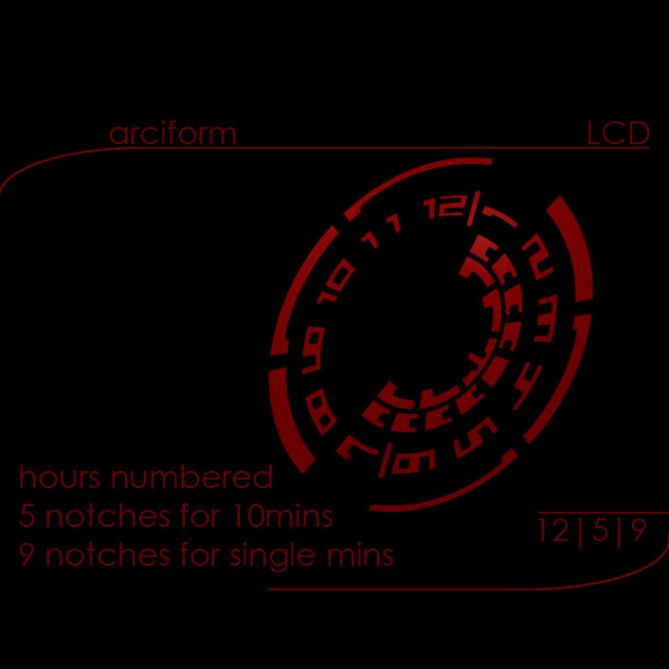 I like this Cory, Its very striking to look at, but very feasible. The time reading takes a little getting used to but easy enough. Loving the angular case!. The only difference I would like to see and its a subjective thing is: I would be tempted to add a rad to two corners of the display (top left and bottom right) just to reduce the blank area of the screen but to also help tie in the display to the case. But this is a preference/development thing thing. Very Hot and Toykyoflashy! 5* and Yes
