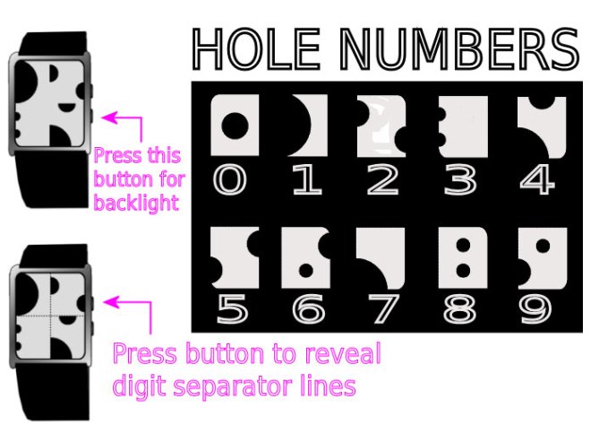 Heather says: My favorite type of display for a watch is a digital, read-at-a-glance, “always on” display that appears cryptic to the outsider. I started with a rectangular four-quadrant format for the digits. By cutting out circular pieces I found that I could create some recognizable yet abstract looking digits.