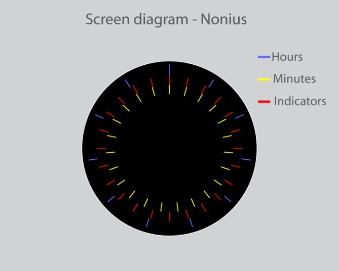 The display is in principle analog, with an array of 24 indicators between 11 outer hour markers and 23 inner minute markers. The hours snap 0,5 degrees clockwise per minute, the minutes 6 degrees and, in order to match up with the minutes, the indicators move 9 degrees counter-clockwise.