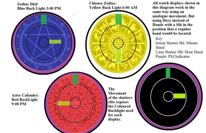 This concept is a analogue movement watch. Instead of Hands their are Two discs with a slit cut into them. As the Hour & Minute Disc move they expose the Coloured Back light with only light up when the Back light button is press on the watch.