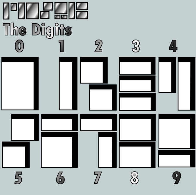 Heather says: I wanted to develop some minimalistic digits that would appear cryptic, yet once learned are quite easy to recognise.  I accomplished this by arranging various sizes of rectangular tiles to give the feel of classic digits.  I call this display “MOSAIC”.