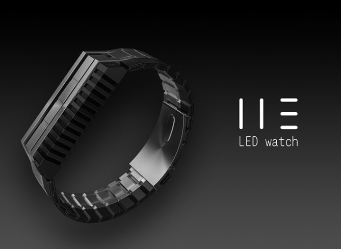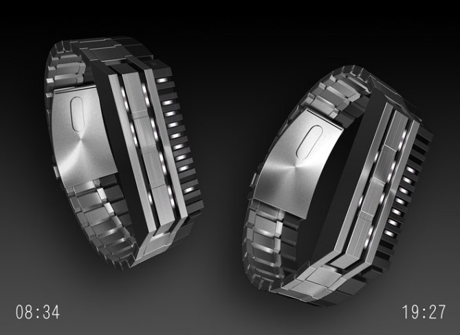 I can imagine a more feminine version in stainless steel where some of the hard edges are more like a smooth curve – could make a very nice looking bracelet that tells time in a cryptic fashion. The white LEDs are a good choice!