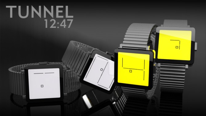 Laszlo says: This watch keeps its LCD screen always on and uses a zoom effect on the digits to make you feel like traveling in a tunnel. The time is shown in four phases and the centrally located small squares help to distinguish the phases. Top left: first digit of the hours, top right: second digit of the hours, bottom left: first digit of minutes, bottom right: second digit of the minutes.