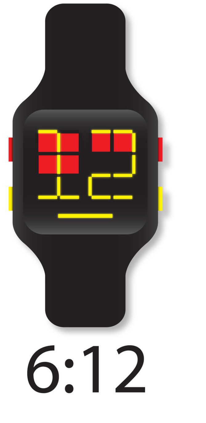 Red squares is the Hours indicator. There are 12 Red. How many light on is what the hours is. Around the Red squares, is 34 Yellow bar, display the minutes like a digital display–numbering shape. The longest yellow bar at the bottom which every seconds is blinking, is the Seconds indicator.