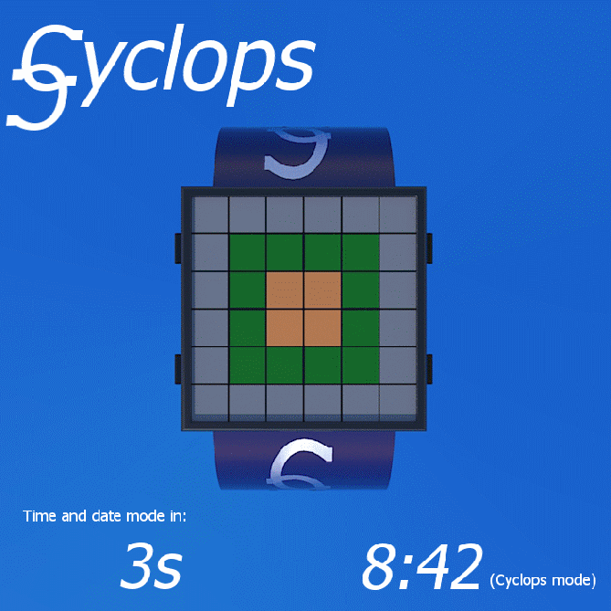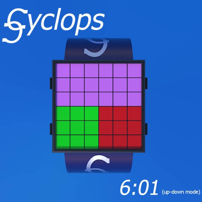 User can choose between two main modes: “Cyclops” mode and “Up-down” mode. In each one, three areas are colour-coded to represent the numbers from 1 – 12. After looking at the colour-code chart and a few example watch faces, it’s easy to see how to tell the time. The watch is also colour-blind friendly, because it provides date and time cheat modes, as well as an animated “time and date” mode with fireworks. The fireworks could optionally be set to light up every hour, drawing attention to the user.