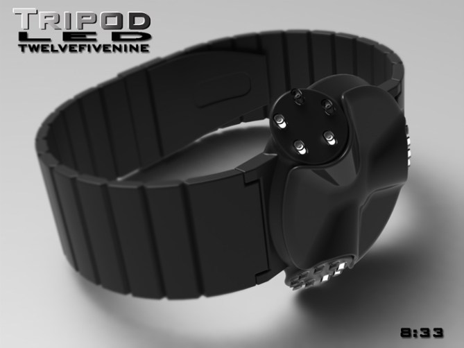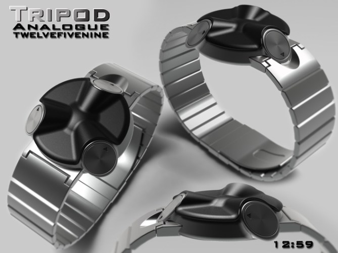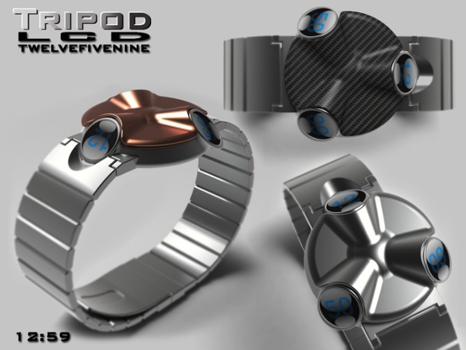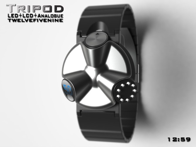 Peter says: I have allways been interested in sci-fi films and wanted to design an unusual alien looking watch. I didn’t have a specific image in mind but the watch evolved into something that resembles a cross between the “Tripods” of “the war of the world” films, the little spacecraft/aliens from “batteries not included” and a mechanised turret.The watch consists of three separate display “Pods”. This layout would lend itself to either LED, LCD or Analogue or a combination of these types of displays. These “Pods” could be interchangable allowing the consumer to choose the combination of display types.