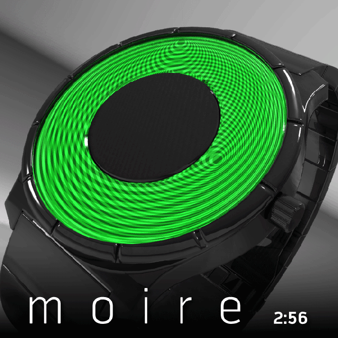 This watch design has two printed acrylic rotating discs that create a moire effect to indicate the tme. Â The inner dot shows the hour and the outer dot shows the minutes.