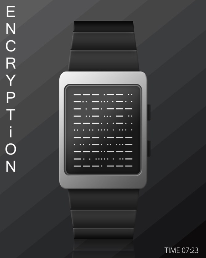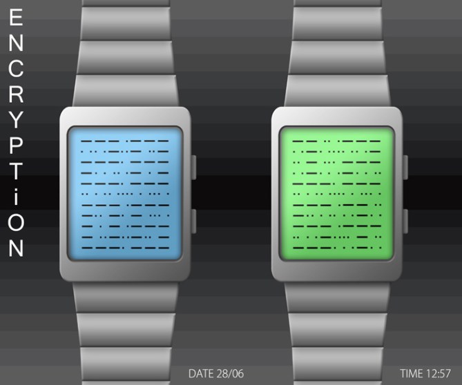 Encryption is USB rechargeable via a computer, and has a Morse code alarm. The watch’s case and strap are made from stainless steel and are available in silver or black. The display is “always on” and is available in several colours.