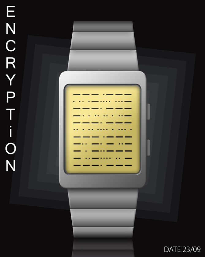 Lloyd Says: “Encryption” is an LCD concept watch that displays the time and date in an enigmatic way using what appears to be Morse code.