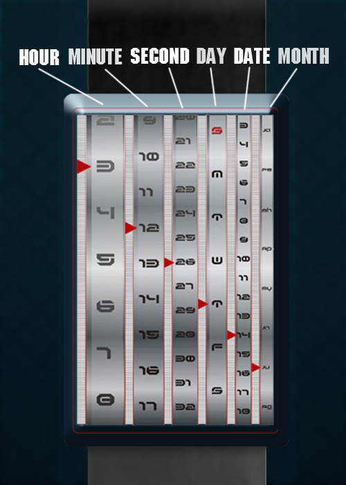 I like this because it has 6 different time lines that move in different speeds. Unfortunately only the seconds lane can be seen moving, but that’s how things are 🙂 I thought about implementing alot of info into a watch too and here maybe I would put the lanes in another order – starting with the quickest and ending with the slowest.