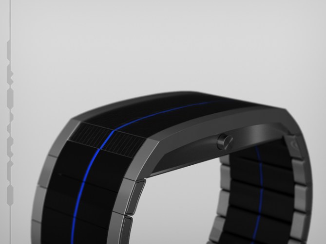 There is also a smooth gradient between the unlit part of the line and the lit one to keep this illusion. The line is “drawn” on a black background and all is framed by chrome. This graphical element continues in the segmented strap and the clasp.