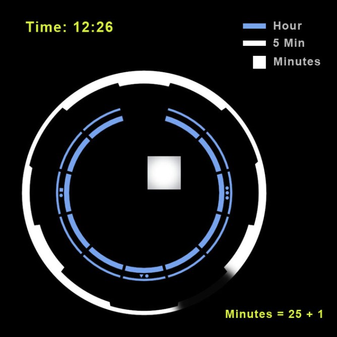 Telling time is quick and intuitive. The circles echo the sweep of the hour and minute hands. The hour circle has markings at the 12, 3, 6, and 9 o’clock postitions to make orientation easier. To calculate the minutes, you just need to find the 5 minute increment, then add the minute squares.