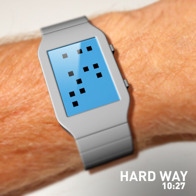 The hard or the easy way? The easy mode a simple digital mode, but the hard mode is very cryptic when you don’t know the solution. You can change the mode of the time telling method on this watch. The upper two digits indicates the hours and the lower two digits is the minutes.