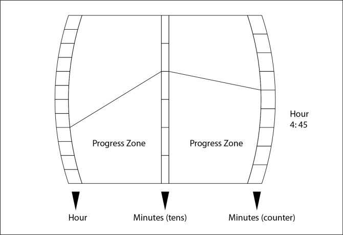 This clock represents graphically the way we tell time with numbers. It has three columns, the first one represents hours, the middle one, minutes in tens (hence six divisions) and finally minutes by units. Between columns there is a progress zone that connects with the respective point at the column to represent the exact time. All you have to do is count, and when you have some experience could tell the time by knowing the shape in the progress zone.