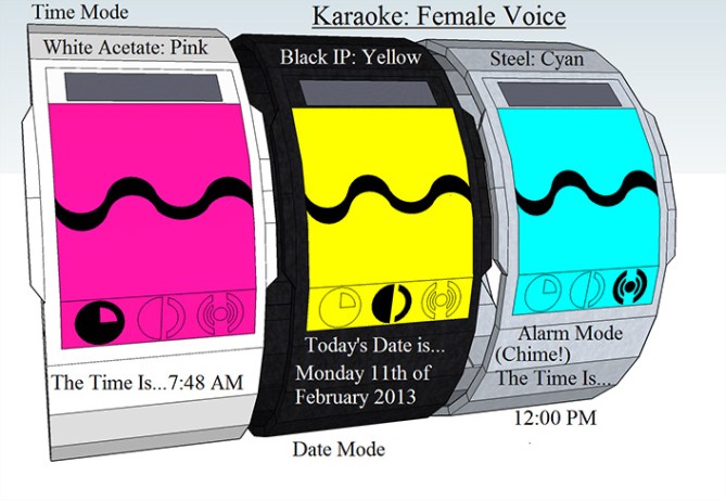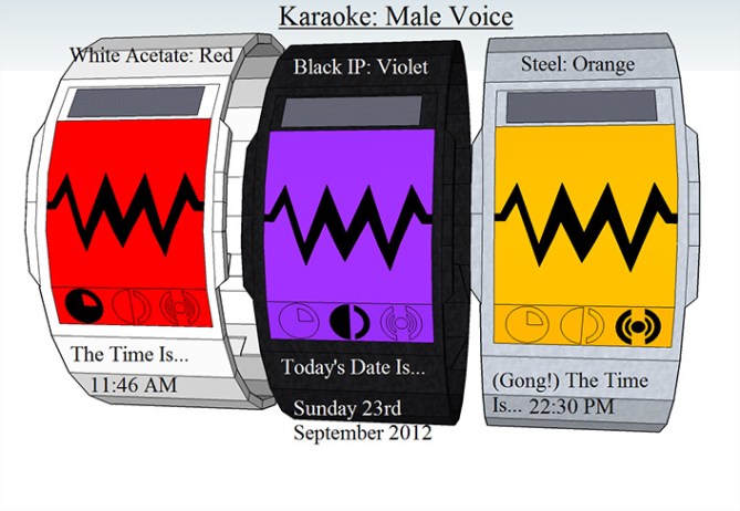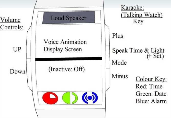 Andrew says: Karaoke a speaking watch that features a LCD or E-ink display screen. This design inspired by the Speaking Clock telephone service which anyone can call on the telephone & find out the correct time: United Kingdom. This watch come preloaded with the official language of your country of origin further languages & guest voice can be uploaded from the Tokyo Flash Website via a USB port/ cable.