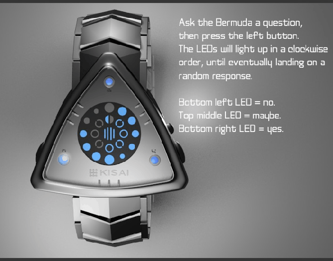First and foremost, this watch tells the time or date using a combination of circles, rings and bars. The true selling point of this watch is an ability to produce an answer to anything you ask it! This is achieved by using LEDs which light up and spin, until landing on a response.