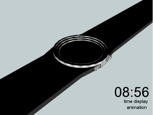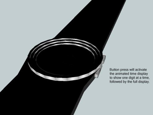 The digits are self explanatory when you allow your mind to fill in the missing part of the center segment for each digit.  The LED time display is animated on button press, first showing each digit one at a time, followed by the full display. There is room in the center for a PM indicator, if necessary.  The decor on the case is meant to emphasize the idea of concavity, as well as the step by step animated display.