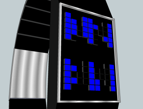 I gave the LED layout a somewhat asymmetric look so it would look cool even when the LEDs are off. Just like STENCIL, the digits are read by looking at the black space in between the columns of LEDs, rather than reading the LEDs themselves. Two digits for hours at the top, and two digits for minutes at the bottom.