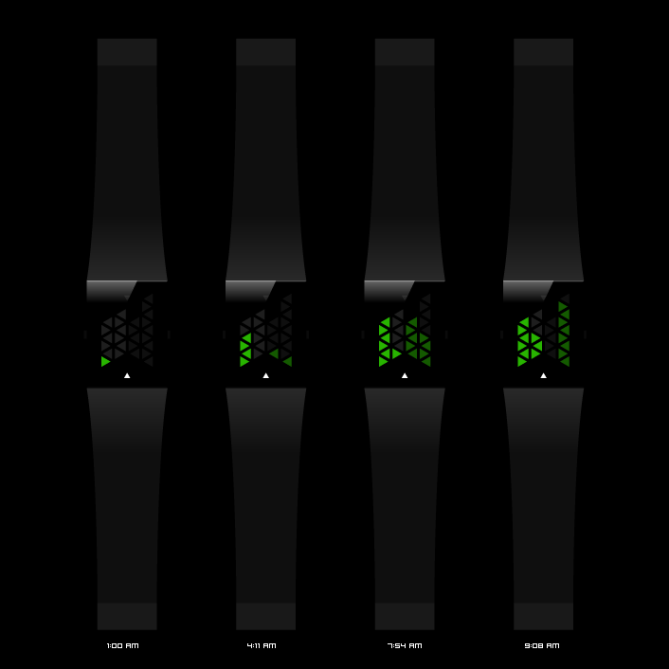 It expresses time by four groups of triangles, representing hours, tens of minutes and single minutes. The time of day can be gathered from the position of the white triangle (down for AM and up for PM).