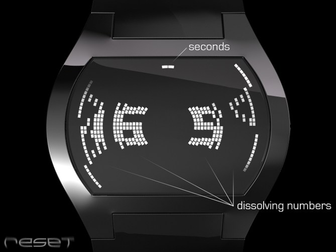 Sam says:Β This watch concept is a proposal for the usage of an accelerometer. The tilting angle of the watch could define the look of the display. Only one special angle lets the watch show the time in a readable fashion. The wearer could define this angle by pressing a button when facing the display. Doing so would RESET the display. Any other angle different from the defined one, causes the numbers to dissolve. The bigger the tilting angle, the stronger the effect.