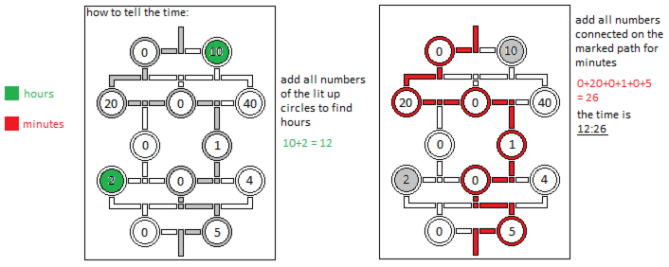 To tell the hours, one simply add the numbers on the nodes where the inside of the circle is lit. The minutes are determined by adding the numbers where the path that runs from top to the bottom of the display comes across, these numbers are also lit up on the outside circle of the nodes.