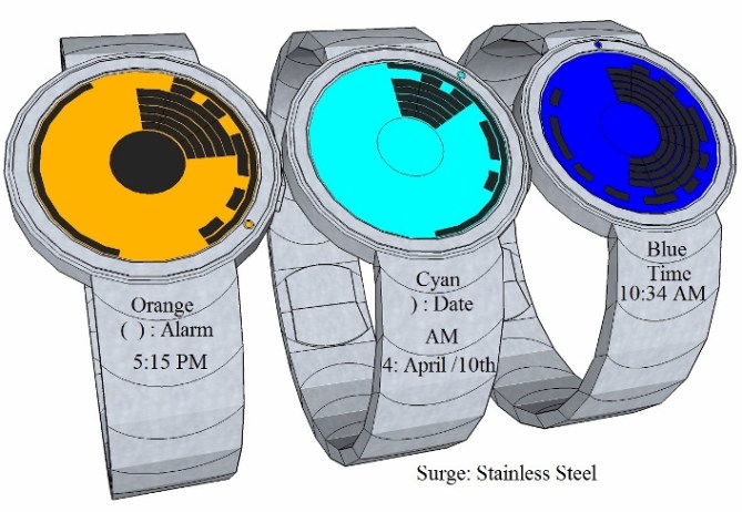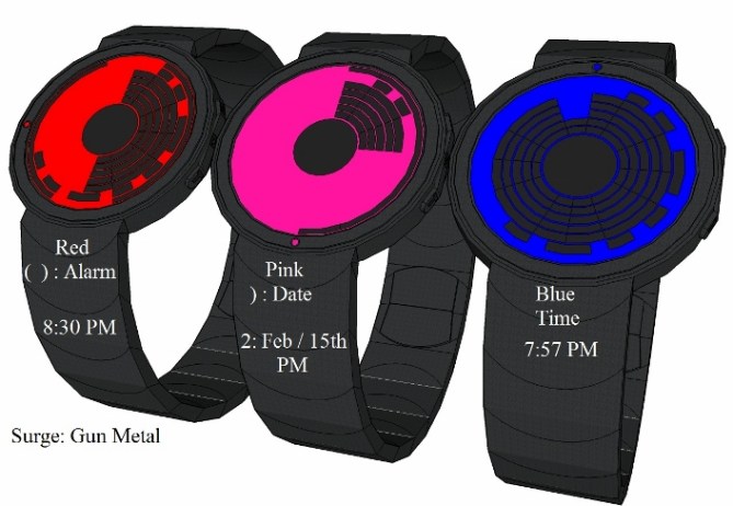 Each of the material versions of the Surge wrist watch has a multiple select LED color Back Light, which the user can change it to suit their mood / outfit etc.