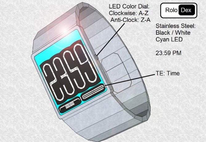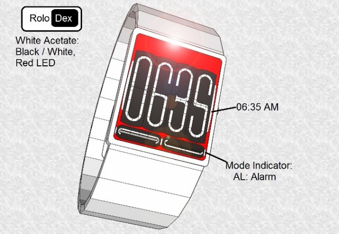 Andrew says: Rolo Dex (MK2) is based on a retro mechanical flip alarm clock, but instead of using a mechanical movement it uses an E-ink / LCD touch Screen Flip Clock animation like those on a Smart phone or PC. The wristwatch is available in three Styles (Flip Tiles / Digits): Black / White, White / Black & a limited Edition: Black & White / LED. Each of which is available the various materials Shown.